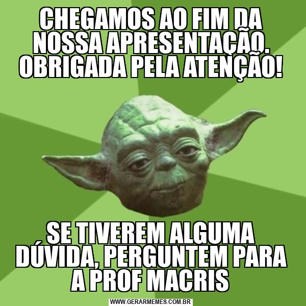CHEGAMOS AO FIM DA NOSSA APRESENTAÇÃO. OBRIGADA PELA ATENÇÃO! SE TIVEREM ALGUMA DÚVIDA, PERGUNTEM PARA A PROF MACRIS