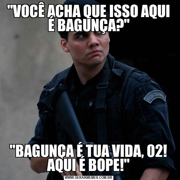 "VOCÊ ACHA QUE ISSO AQUI É BAGUNÇA?" "BAGUNÇA É TUA VIDA, 02! AQUI É BOPE!"