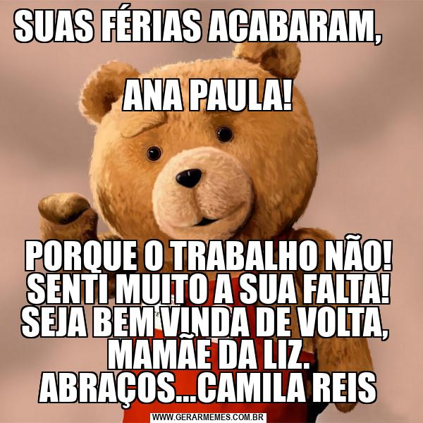 SUAS FÉRIAS ACABARAM, ANA PAULA! PORQUE O TRABALHO NÃO! SENTI MUITO A SUA FALTA! SEJA BEM VINDA DE VOLTA, MAMÃE DA LIZ. ABRAÇOS...CAMILA REIS