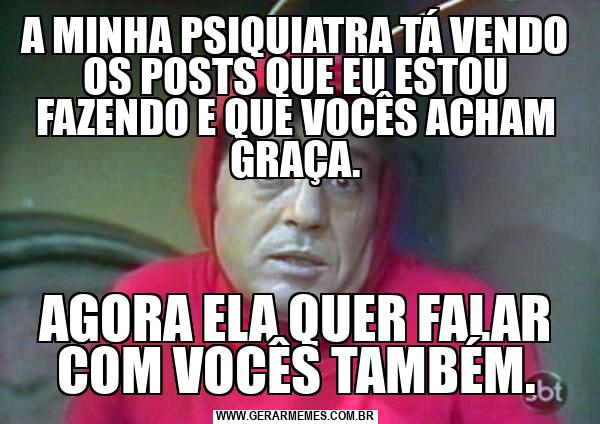 A MINHA PSIQUIATRA TÁ VENDO OS POSTS QUE EU ESTOU FAZENDO E QUE VOCÊS ACHAM GRAÇA. AGORA ELA QUER FALAR COM VOCÊS TAMBÉM.