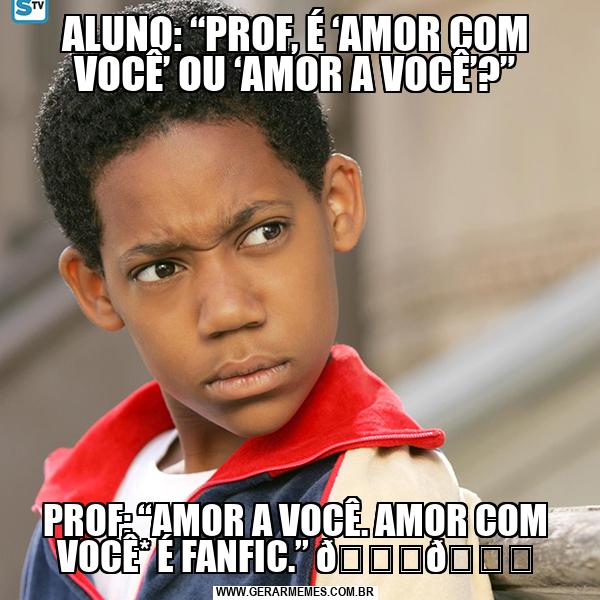 ALUNO: “PROF, É ‘AMOR COM VOCÊ’ OU ‘AMOR A VOCÊ’?” PROF: “AMOR A VOCÊ. AMOR COM VOCÊ* É FANFIC.”