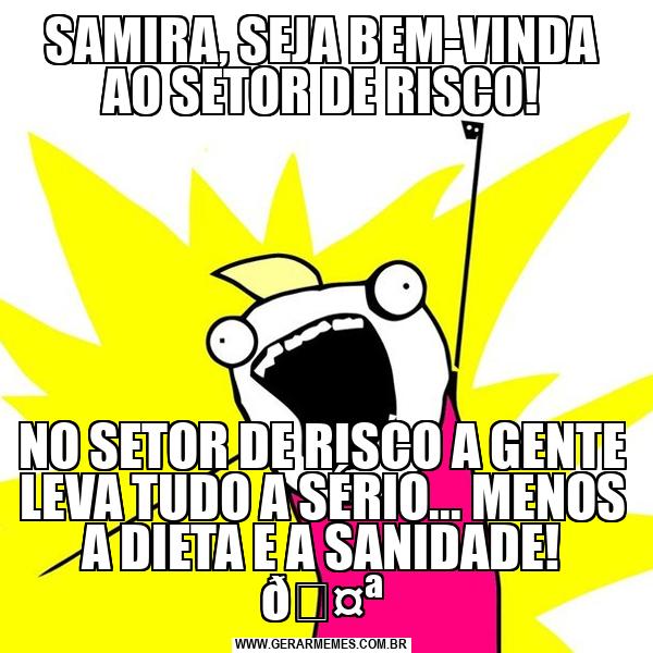 SAMIRA, SEJA BEM-VINDA AO SETOR DE RISCO! NO SETOR DE RISCO A GENTE LEVA TUDO A SÉRIO... MENOS A DIETA E A SANIDADE!