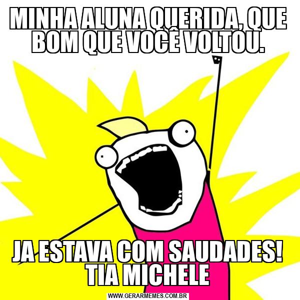 MINHA ALUNA QUERIDA, QUE BOM QUE VOCÊ VOLTOU. JA ESTAVA COM SAUDADES! TIA MICHELE