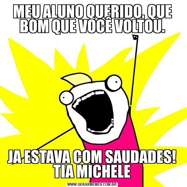 MEU ALUNO QUERIDO, QUE BOM QUE VOCÊ VOLTOU. JA ESTAVA COM SAUDADES! TIA MICHELE