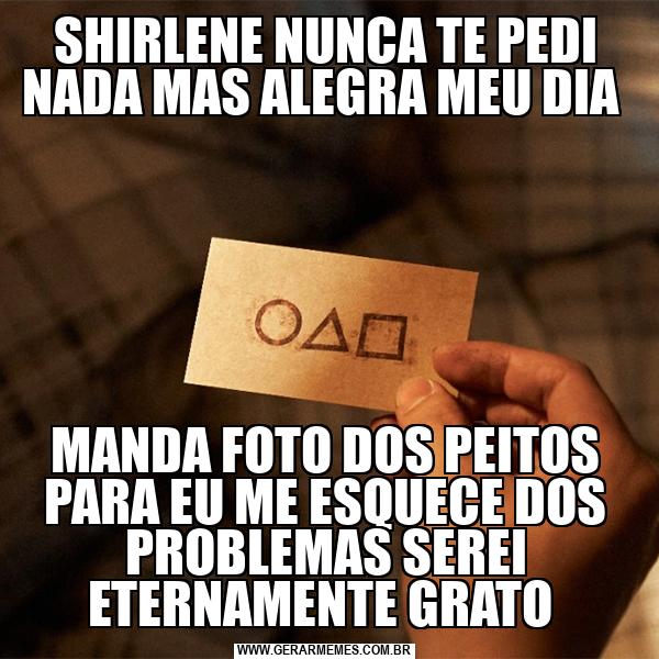 SHIRLENE NUNCA TE PEDI NADA MAS ALEGRA MEU DIA MANDA FOTO DOS PEITOS PARA EU ME ESQUECE DOS PROBLEMAS SEREI ETERNAMENTE GRATO