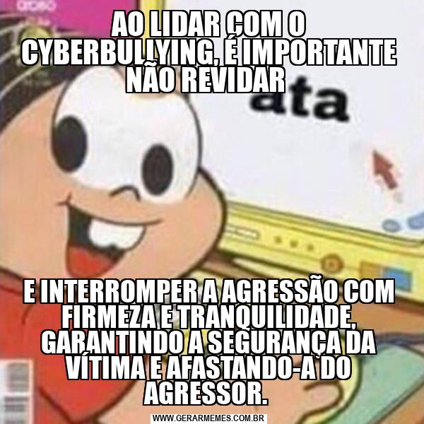 AO LIDAR COM O CYBERBULLYING, É IMPORTANTE NÃO REVIDAR E INTERROMPER A AGRESSÃO COM FIRMEZA E TRANQUILIDADE, GARANTINDO A SEGURANÇA DA VÍTIMA E AFASTANDO-A DO AGRESSOR.