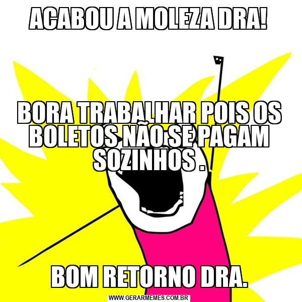 ACABOU A MOLEZA DRA! BORA TRABALHAR POIS OS BOLETOS NÃO SE PAGAM SOZINHOS . BOM RETORNO DRA.