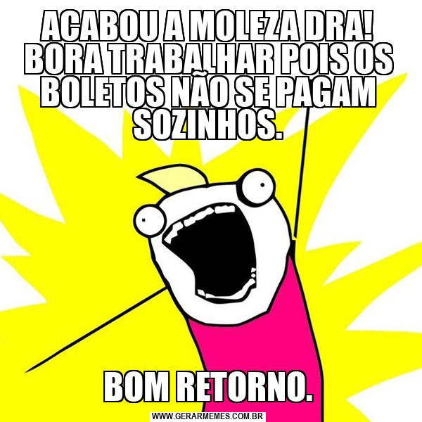 ACABOU A MOLEZA DRA! BORA TRABALHAR POIS OS BOLETOS NÃO SE PAGAM SOZINHOS. BOM RETORNO.