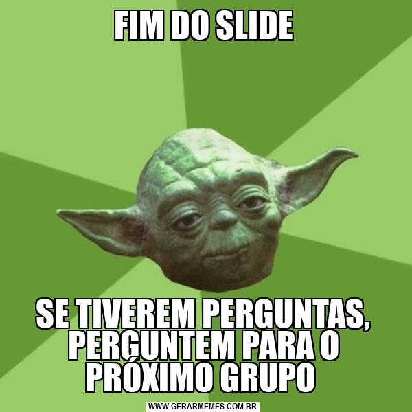 FIM DO SLIDE SE TIVEREM PERGUNTAS, PERGUNTEM PARA O PRÓXIMO GRUPO
