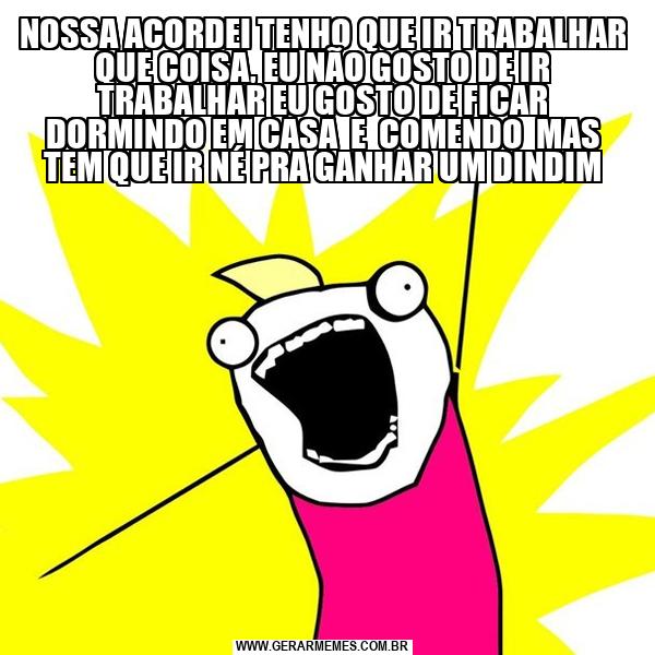 NOSSA ACORDEI TENHO QUE IR TRABALHAR QUE COISA, EU NÃO GOSTO DE IR TRABALHAR EU GOSTO DE FICAR DORMINDO EM CASA E COMENDO MAS TEM QUE IR NÉ PRA GANHAR UM DINDIM