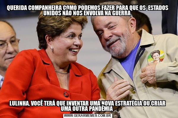 QUERIDA COMPANHEIRA COMO PODEMOS FAZER PARA QUE OS ESTADOS UNIDOS NÃO NOS ENVOLVA NA GUERRA LULINHA, VOCÊ TERÁ QUE INVENTAR UMA NOVA ESTRATÉGIA OU CRIAR UMA OUTRA PANDÊMIA