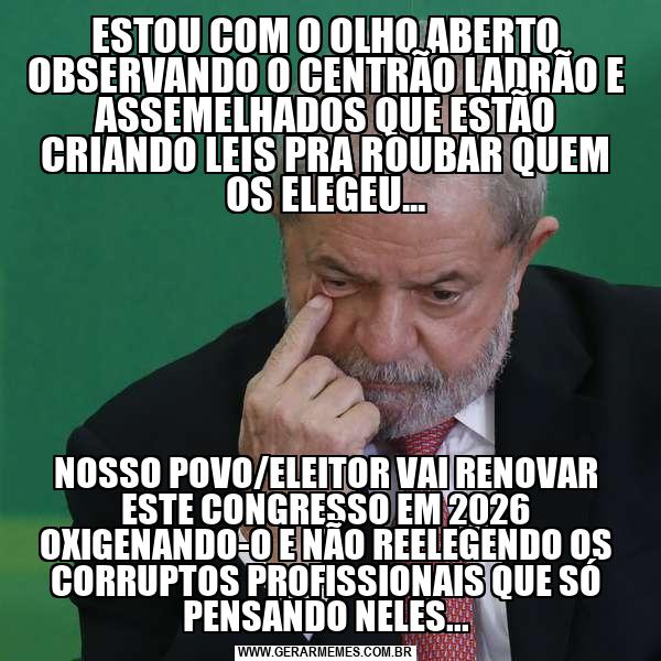 ESTOU COM O OLHO ABERTO OBSERVANDO O CENTRÃO LADRÃO E ASSEMELHADOS QUE ESTÃO CRIANDO LEIS PRA ROUBAR QUEM OS ELEGEU... NOSSO POVO/ELEITOR VAI RENOVAR ESTE CONGRESSO EM 2026 OXIGENANDO-O E NÃO REELEGENDO OS CORRUPTOS PROFISSIONAIS QUE SÓ PENSANDO NELES...