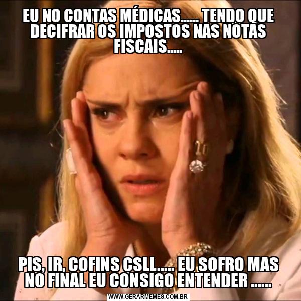 EU NO CONTAS MÉDICAS...... TENDO QUE DECIFRAR OS IMPOSTOS NAS NOTAS FISCAIS..... PIS, IR, COFINS CSLL..... EU SOFRO MAS NO FINAL EU CONSIGO ENTENDER ......