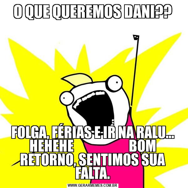 O QUE QUEREMOS DANI?? FOLGA, FÉRIAS E IR NA RALU... HEHEHE BOM RETORNO, SENTIMOS SUA FALTA.