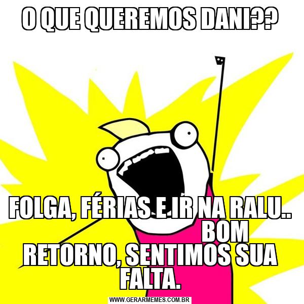 O QUE QUEREMOS DANI?? FOLGA, FÉRIAS E IR NA RALU.. BOM RETORNO, SENTIMOS SUA FALTA.