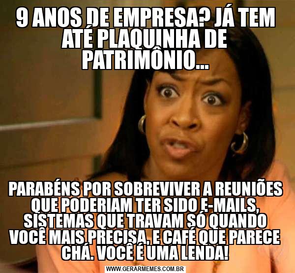 9 ANOS DE EMPRESA? JÁ TEM ATÉ PLAQUINHA DE PATRIMÔNIO... PARABÉNS POR SOBREVIVER A REUNIÕES QUE PODERIAM TER SIDO E-MAILS, SISTEMAS QUE TRAVAM SÓ QUANDO VOCÊ MAIS PRECISA, E CAFÉ QUE PARECE CHÁ. VOCÊ É UMA LENDA!