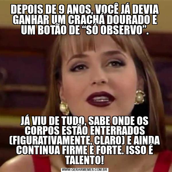 DEPOIS DE 9 ANOS, VOCÊ JÁ DEVIA GANHAR UM CRACHÁ DOURADO E UM BOTÃO DE “SÓ OBSERVO”. JÁ VIU DE TUDO, SABE ONDE OS CORPOS ESTÃO ENTERRADOS (FIGURATIVAMENTE, CLARO) E AINDA CONTINUA FIRME E FORTE. ISSO É TALENTO!
