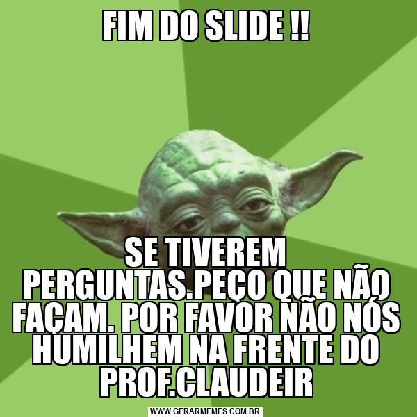 FIM DO SLIDE !! SE TIVEREM PERGUNTAS.PEÇO QUE NÃO FAÇAM. POR FAVOR NÃO NÓS HUMILHEM NA FRENTE DO PROF.CLAUDEIR