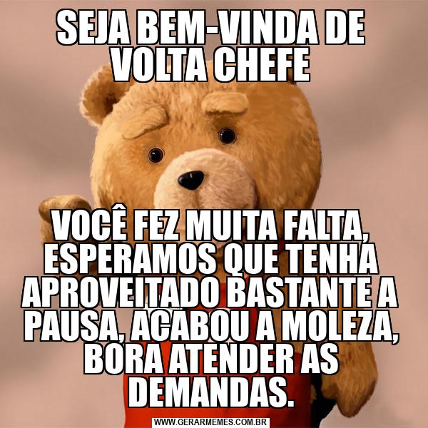 SEJA BEM-VINDA DE VOLTA CHEFE VOCÊ FEZ MUITA FALTA, ESPERAMOS QUE TENHA APROVEITADO BASTANTE A PAUSA, ACABOU A MOLEZA, BORA ATENDER AS DEMANDAS.