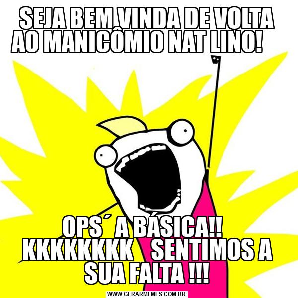 SEJA BEM VINDA DE VOLTA AO MANICÔMIO NAT LINO! OPS´ A BÁSICA!! KKKKKKKK SENTIMOS A SUA FALTA !!!