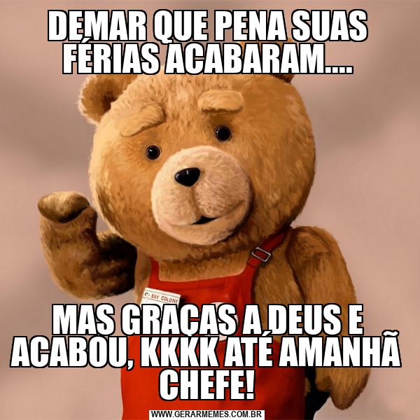 DEMAR QUE PENA SUAS FÉRIAS ACABARAM.... MAS GRAÇAS A DEUS E ACABOU, KKKK ATÉ AMANHÃ CHEFE!