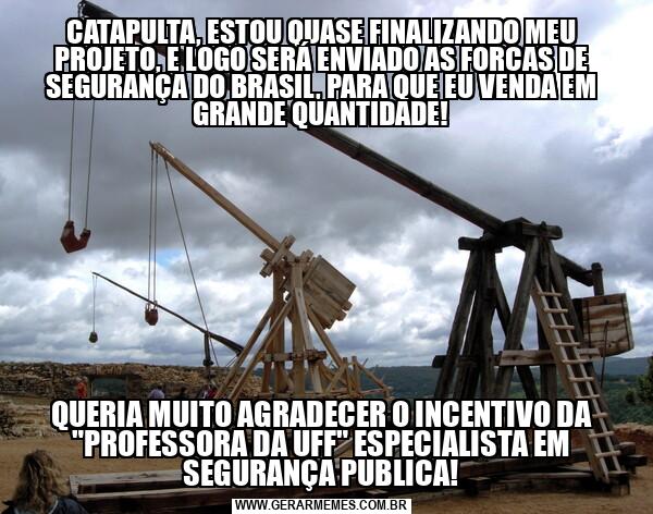 CATAPULTA, ESTOU QUASE FINALIZANDO MEU PROJETO, E LOGO SERÁ ENVIADO AS FORCAS DE SEGURANÇA DO BRASIL, PARA QUE EU VENDA EM GRANDE QUANTIDADE! QUERIA MUITO AGRADECER O INCENTIVO DA "PROFESSORA DA UFF" ESPECIALISTA EM SEGURANÇA PUBLICA!
