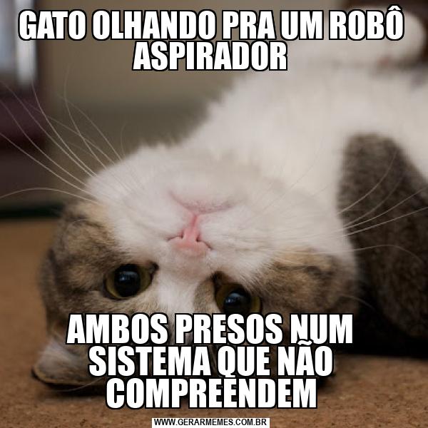 GATO OLHANDO PRA UM ROBÔ ASPIRADOR AMBOS PRESOS NUM SISTEMA QUE NÃO COMPREENDEM