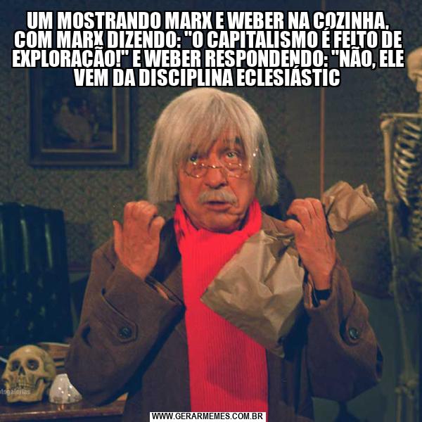 UM MOSTRANDO MARX E WEBER NA COZINHA, COM MARX DIZENDO: "O CAPITALISMO É FEITO DE EXPLORAÇÃO!" E WEBER RESPONDENDO: "NÃO, ELE VEM DA DISCIPLINA ECLESIÁSTIC