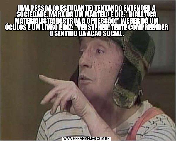 UMA PESSOA (O ESTUDANTE) TENTANDO ENTENDER A SOCIEDADE. MARX DÁ UM MARTELO E DIZ: "DIALÉTICA MATERIALISTA! DESTRUA A OPRESSÃO!" WEBER DÁ UM ÓCULOS E UM LIVRO E DIZ: "VERSTEHEN! TENTE COMPREENDER O SENTIDO DA AÇÃO SOCIAL.