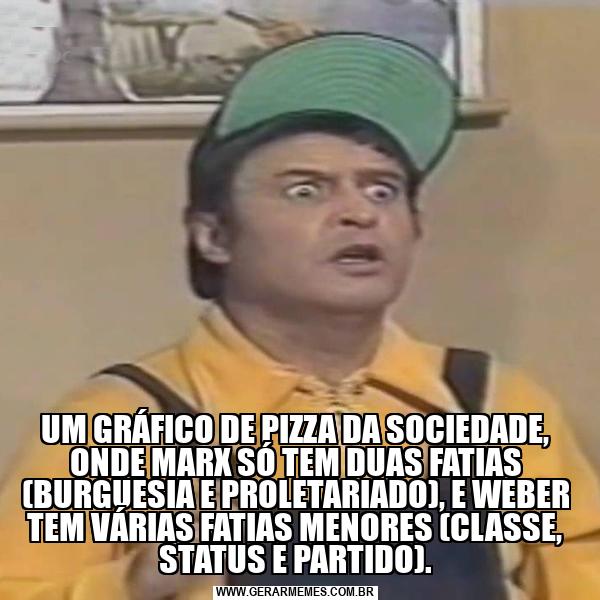 UM GRÁFICO DE PIZZA DA SOCIEDADE, ONDE MARX SÓ TEM DUAS FATIAS (BURGUESIA E PROLETARIADO), E WEBER TEM VÁRIAS FATIAS MENORES (CLASSE, STATUS E PARTIDO).