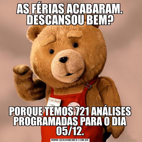 AS FÉRIAS ACABARAM. DESCANSOU BEM? PORQUE TEMOS 721 ANÁLISES PROGRAMADAS PARA O DIA 05/12.