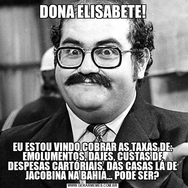 DONA ELISABETE! EU ESTOU VINDO COBRAR AS TAXAS DE: EMOLUMENTOS, DAJES, CUSTAS DE DESPESAS CARTÓRIAIS, DAS CASAS LÁ DE JACOBINA NA BAHIA... PODE SER?