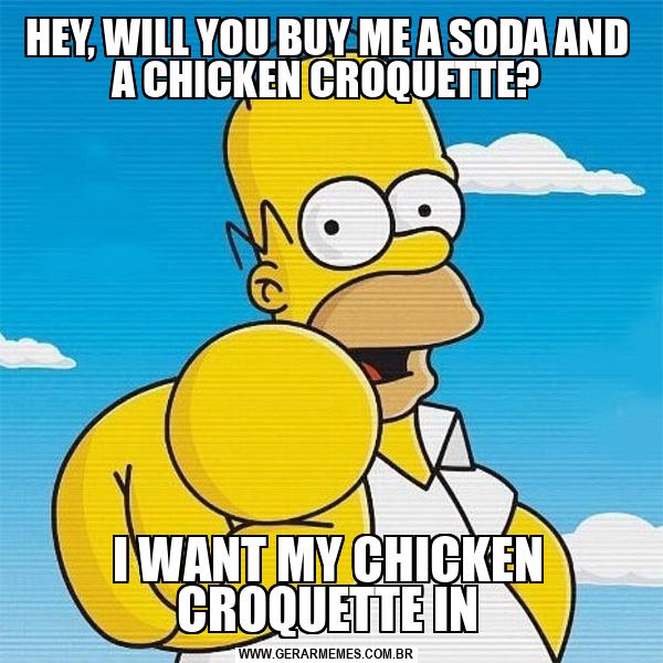 HEY, WILL YOU BUY ME A SODA AND A CHICKEN CROQUETTE? I WANT MY CHICKEN CROQUETTE IN