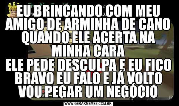 EU BRINCANDO COM MEU AMIGO DE ARMINHA DE CANO QUANDO ELE ACERTA NA MINHA CARA ELE PEDE DESCULPA E EU FICO BRAVO EU FALO E JÁ VOLTO VOU PEGAR UM NEGÓCIO