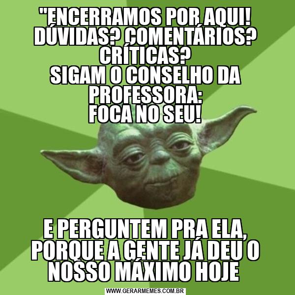 "ENCERRAMOS POR AQUI! DÚVIDAS? COMENTÁRIOS? CRÍTICAS? SIGAM O CONSELHO DA PROFESSORA: FOCA NO SEU! E PERGUNTEM PRA ELA, PORQUE A GENTE JÁ DEU O NOSSO MÁXIMO HOJE