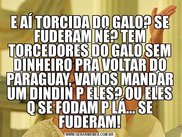 E AÍ TORCIDA DO GALO? SE FUDERAM NÉ? TEM TORCEDORES DO GALO SEM DINHEIRO PRA VOLTAR DO PARAGUAY, VAMOS MANDAR UM DINDIN P ELES? OU ELES Q SE FODAM P LÁ... SE FUDERAM!