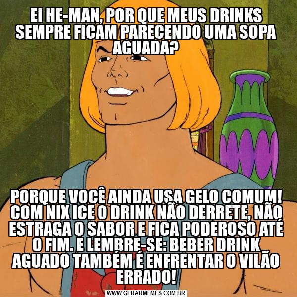 EI HE-MAN, POR QUE MEUS DRINKS SEMPRE FICAM PARECENDO UMA SOPA AGUADA? PORQUE VOCÊ AINDA USA GELO COMUM! COM NIX ICE O DRINK NÃO DERRETE, NÃO ESTRAGA O SABOR E FICA PODEROSO ATÉ O FIM. E LEMBRE-SE: BEBER DRINK AGUADO TAMBÉM É ENFRENTAR O VILÃO ERRADO!