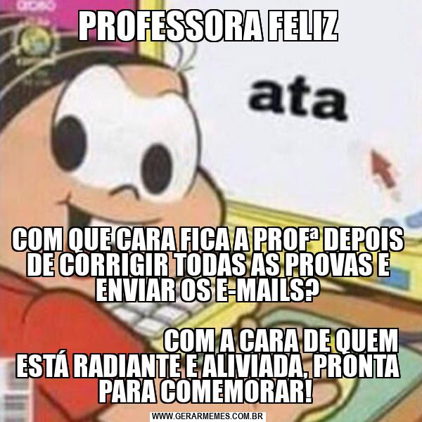 PROFESSORA FELIZ COM QUE CARA FICA A PROFª DEPOIS DE CORRIGIR TODAS AS PROVAS E ENVIAR OS E-MAILS? COM A CARA DE QUEM ESTÁ RADIANTE E ALIVIADA, PRONTA PARA