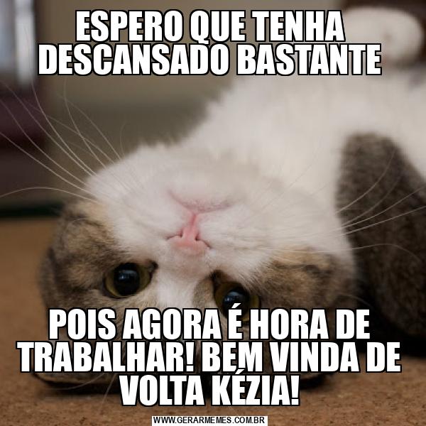 ESPERO QUE TENHA DESCANSADO BASTANTE POIS AGORA É HORA DE TRABALHAR! BEM VINDA DE VOLTA KÉZIA!