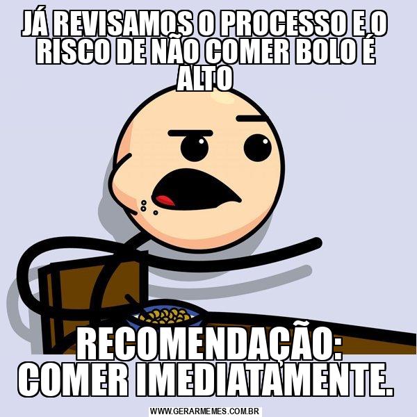 JÁ REVISAMOS O PROCESSO E O RISCO DE NÃO COMER BOLO É ALTO RECOMENDAÇÃO: COMER IMEDIATAMENTE.