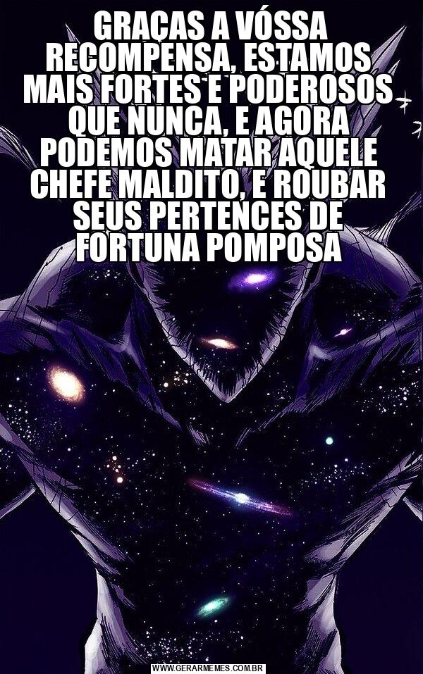GRAÇAS A VÓSSA RECOMPENSA, ESTAMOS MAIS FORTES E PODEROSOS QUE NUNCA, E AGORA PODEMOS MATAR AQUELE CHEFE MALDITO, E ROUBAR SEUS PERTENCES DE FORTUNA POMPOSA