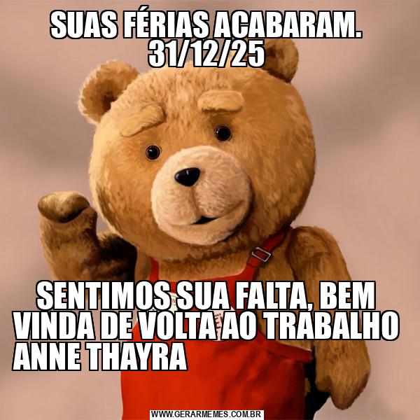 SUAS FÉRIAS ACABARAM. 31/12/25 SENTIMOS SUA FALTA, BEM VINDA DE VOLTA AO TRABALHO ANNE THAYRA