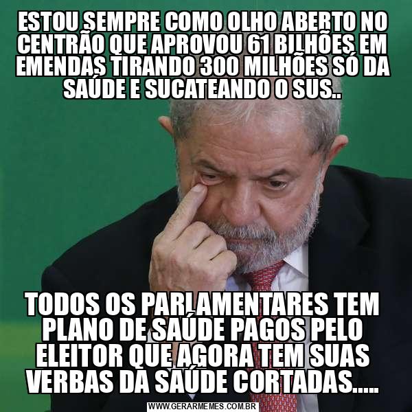 ESTOU SEMPRE COMO OLHO ABERTO NO CENTRÃO QUE APROVOU 61 BILHÕES EM EMENDAS TIRANDO 300 MILHÕES SÓ DA SAÚDE E SUCATEANDO O SUS.. TODOS OS PARLAMENTARES TEM PLANO DE SAÚDE PAGOS PELO ELEITOR QUE AGORA TEM SUAS VERBAS DA SAÚDE CORTADAS.....