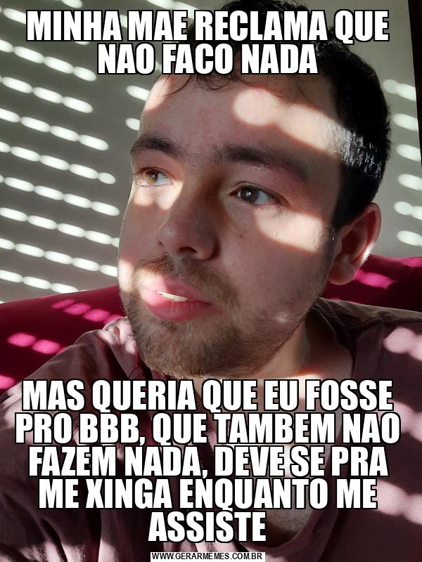MINHA MAE RECLAMA QUE NAO FACO NADA MAS QUERIA QUE EU FOSSE PRO BBB, QUE TAMBEM NAO FAZEM NADA, DEVE SE PRA ME XINGA ENQUANTO ME ASSISTE