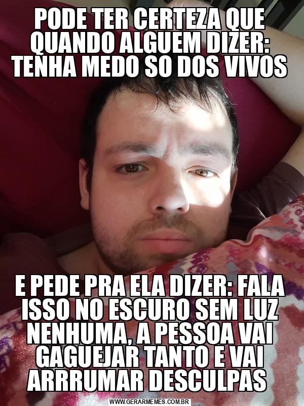PODE TER CERTEZA QUE QUANDO ALGUEM DIZER: TENHA MEDO SO DOS VIVOS E PEDE PRA ELA DIZER: FALA ISSO NO ESCURO SEM LUZ NENHUMA, A PESSOA VAI GAGUEJAR TANTO E VAI ARRRUMAR DESCULPAS