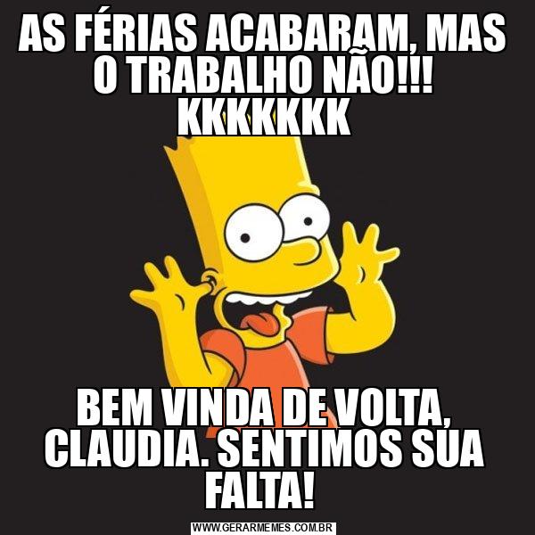 AS FÉRIAS ACABARAM, MAS O TRABALHO NÃO!!! KKKKKKK BEM VINDA DE VOLTA, CLAUDIA. SENTIMOS SUA FALTA!