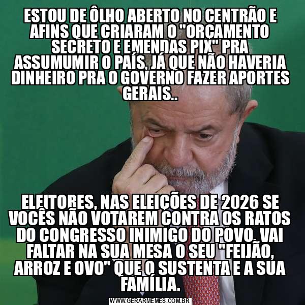 ESTOU DE ÔLHO ABERTO NO CENTRÃO E AFINS QUE CRIARAM O "ORÇAMENTO SECRETO E EMENDAS PIX" PRA ASSUMUMIR O PAÍS, JÁ QUE NÃO HAVERIA DINHEIRO PRA O GOVERNO FAZER APORTES GERAIS.. ELEITORES, NAS ELEIÇÕES DE 2026 SE VOCÊS NÃO VOTAREM CONTRA OS RATOS DO CONGRESSO INIMIGO DO POVO, VAI FALTAR NA SUA MESA O SEU "FEIJÃO, ARROZ E OVO" QUE O SUSTENTA E A SUA FAMÍLIA.