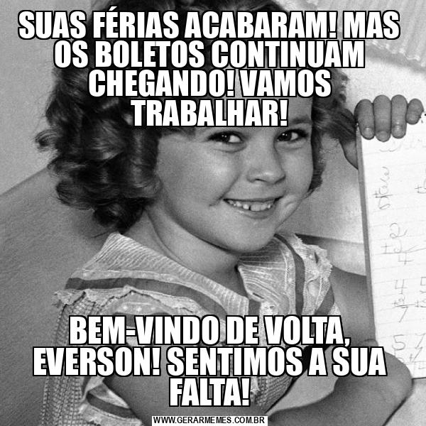 SUAS FÉRIAS ACABARAM! MAS OS BOLETOS CONTINUAM CHEGANDO! VAMOS TRABALHAR! BEM-VINDO DE VOLTA, EVERSON! SENTIMOS A SUA FALTA!