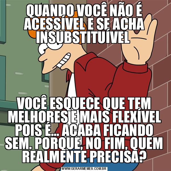 QUANDO VOCÊ NÃO É ACESSÍVEL E SE ACHA INSUBSTITUÍVEL VOCÊ ESQUECE QUE TEM MELHORES E MAIS FLEXÍVEL POIS É… ACABA FICANDO SEM. PORQUE, NO FIM, QUEM REALMENTE PRECISA?