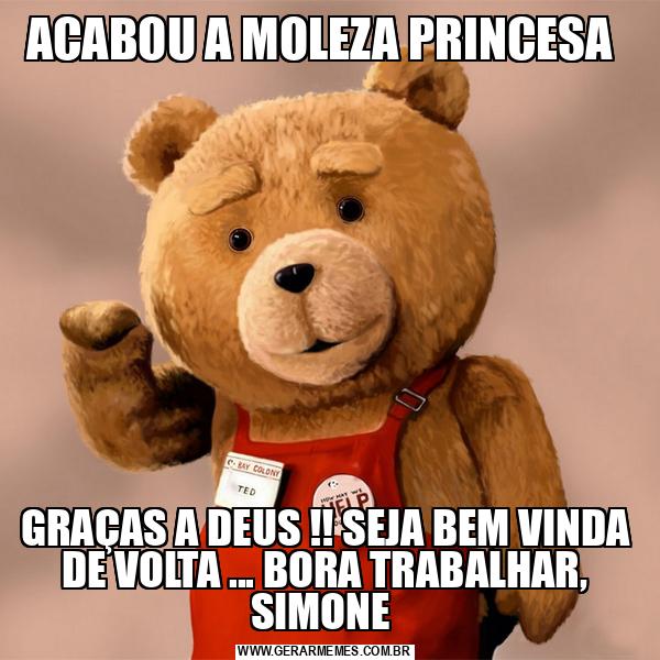 ACABOU A MOLEZA PRINCESA GRAÇAS A DEUS !! SEJA BEM VINDA DE VOLTA ... BORA TRABALHAR, SIMONE